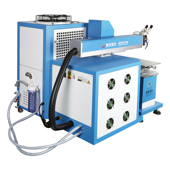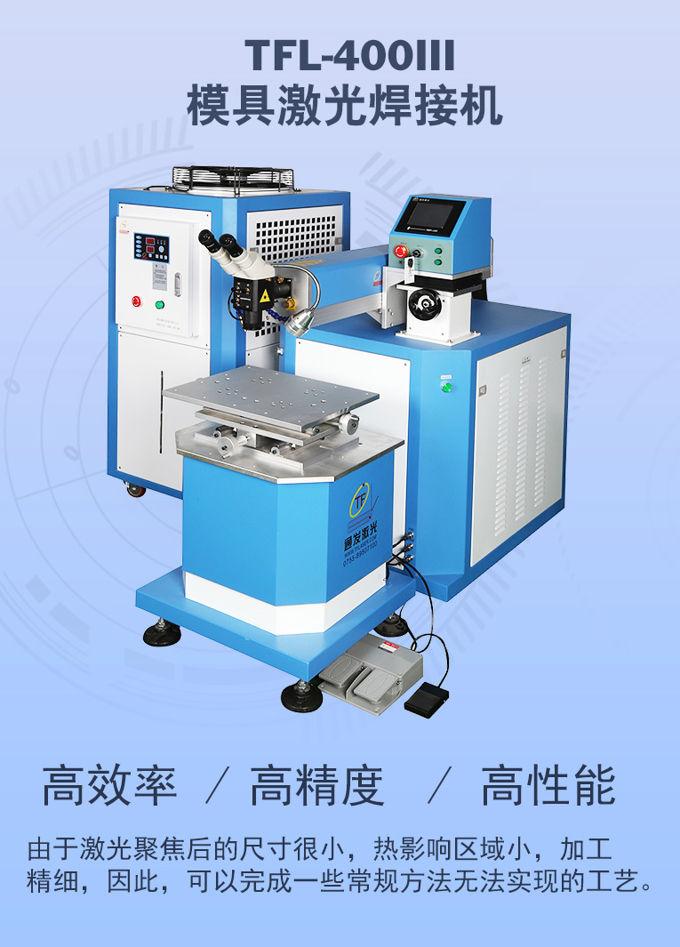 TFL-400Ⅲ型模具激光焊機是通發激光公司自主研發的一款大功率激光焊接機,采用通發自主研發的二代精密雙燈電源為燈泵浦驅動電源,配置觸摸屏,操作更方便。主機具備激光頭手搖升降與工作臺按鈕電動升降實現焊接不同厚度模具的激光焊加工。本款機型更適用于各類大功率、大面積激光修補的模具。由于激光功率大,同時可激光焊接鈹銅模具,鋁材模具或鋁材零件。在大面積激光修補模具時,可以使用更粗的焊絲,激光焊接效率大幅提升。